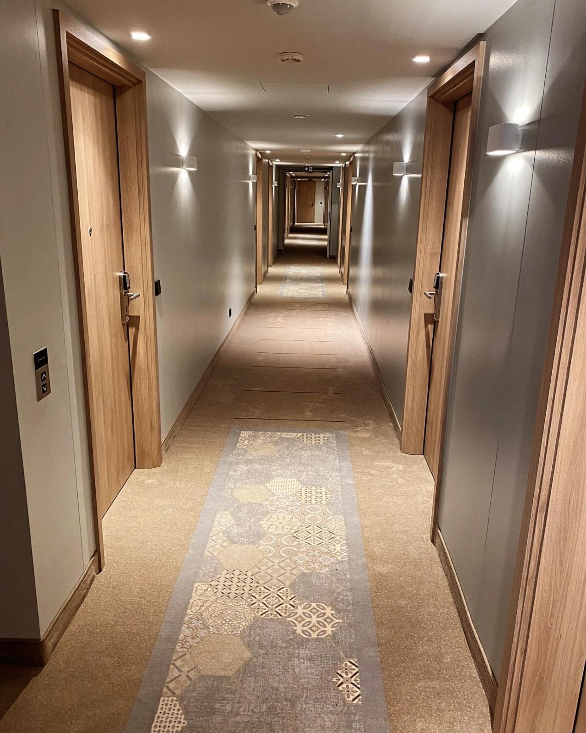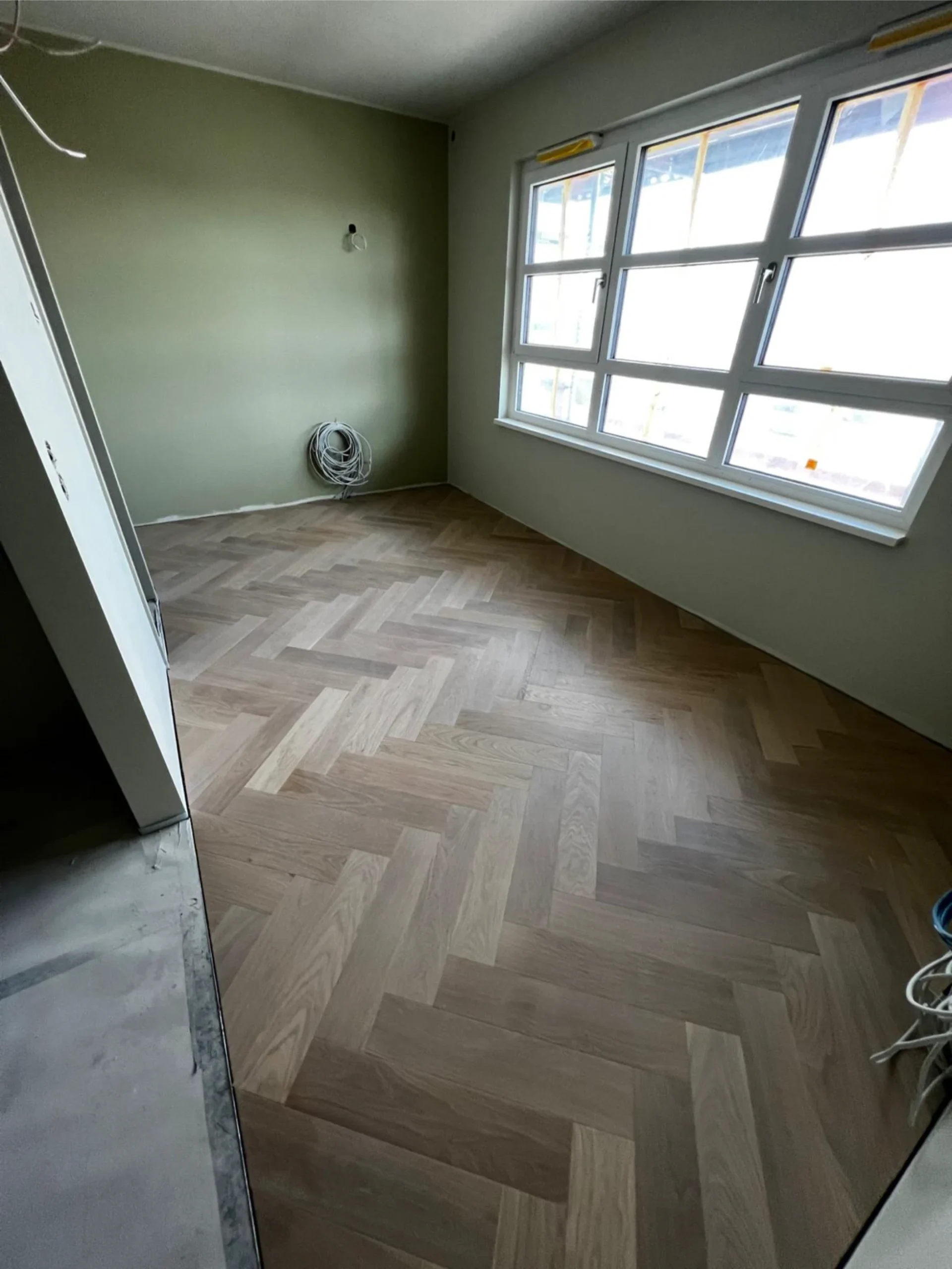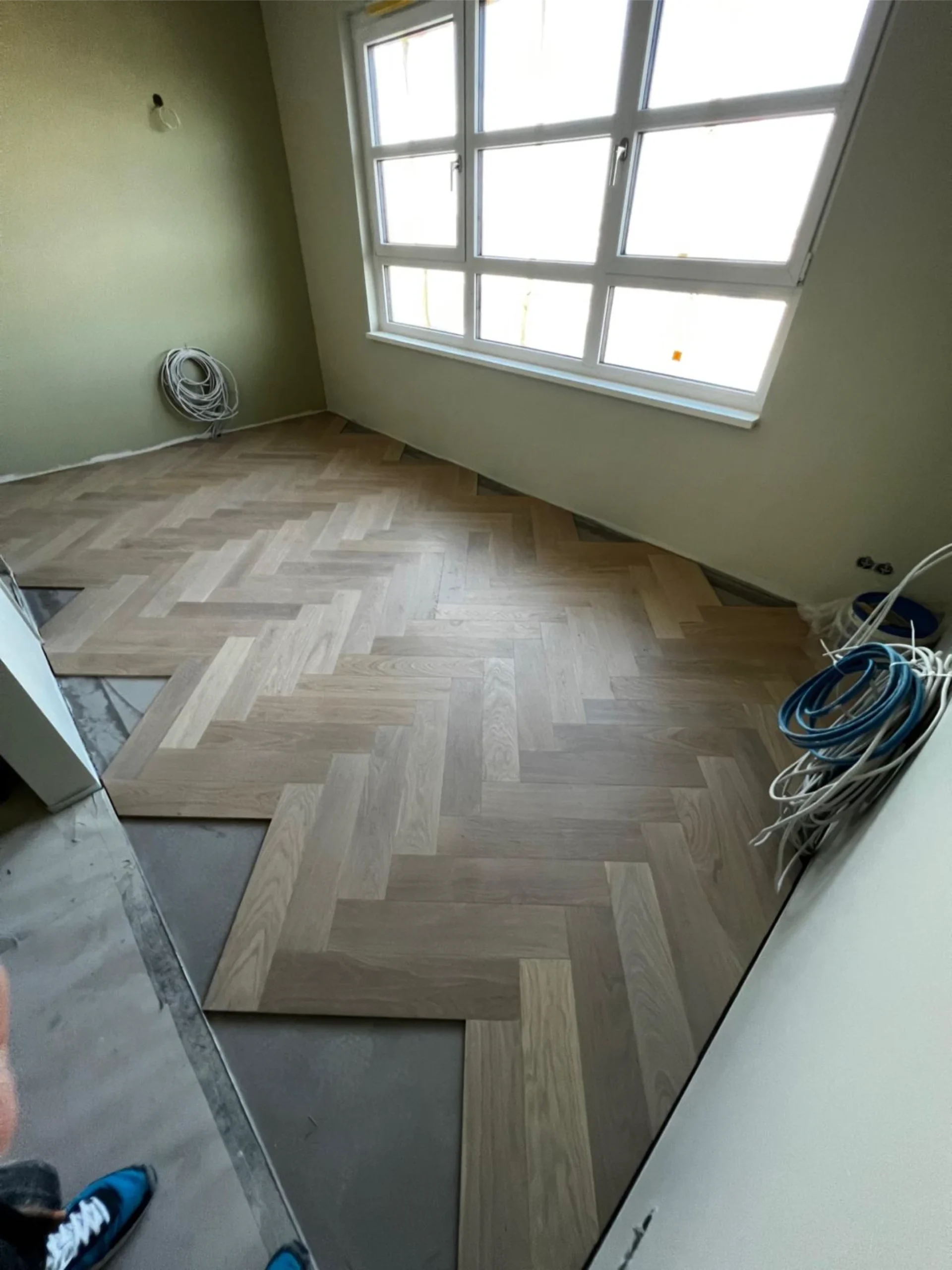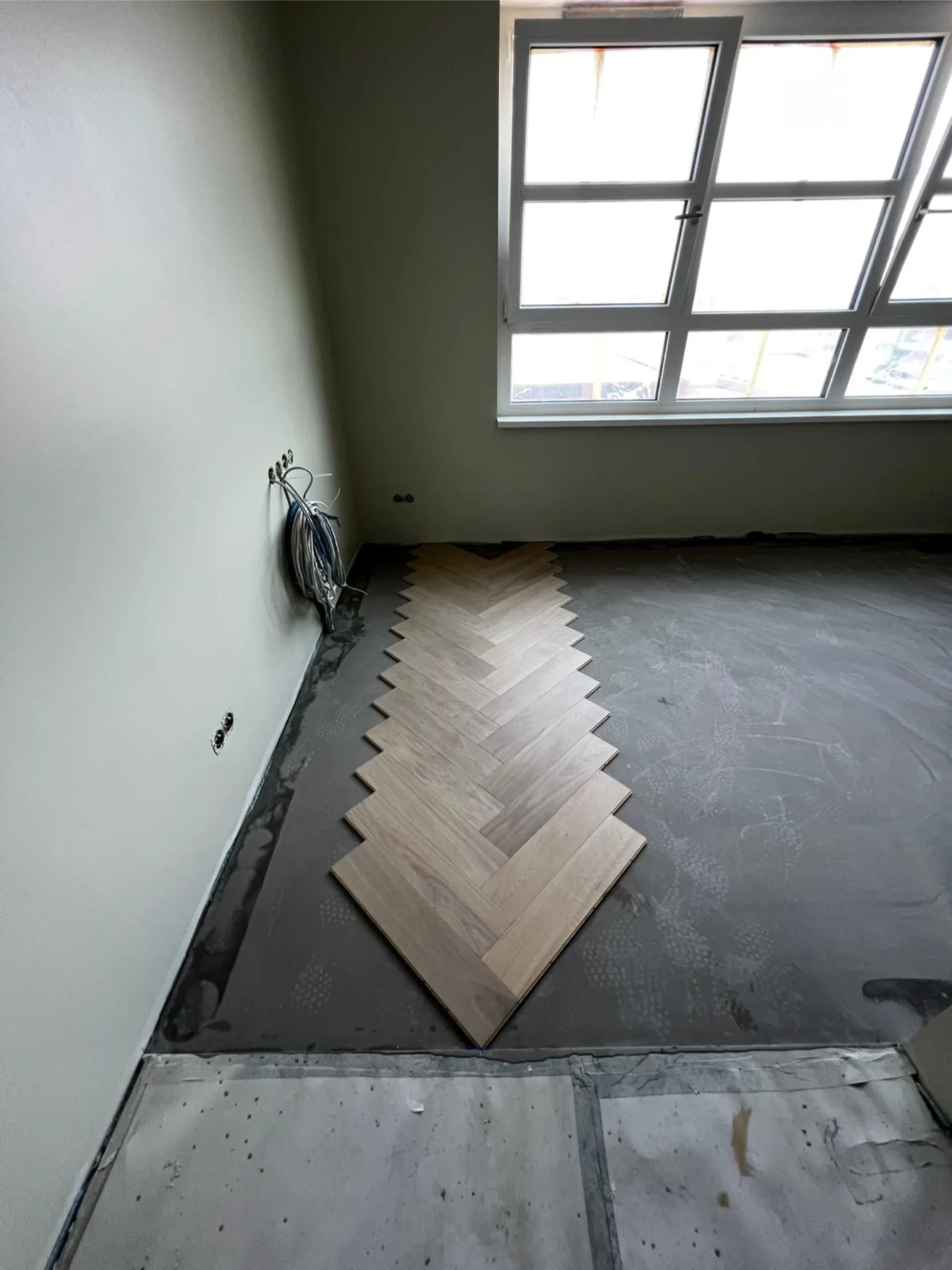 Vorbereitung der Böden für weißes Fischgrätparkett in 84 Hotelzimmern inklusive Montage schwarzer Sockelleisten. Verlegung maßgefertigter Design-Teppichböden in den Fluren.