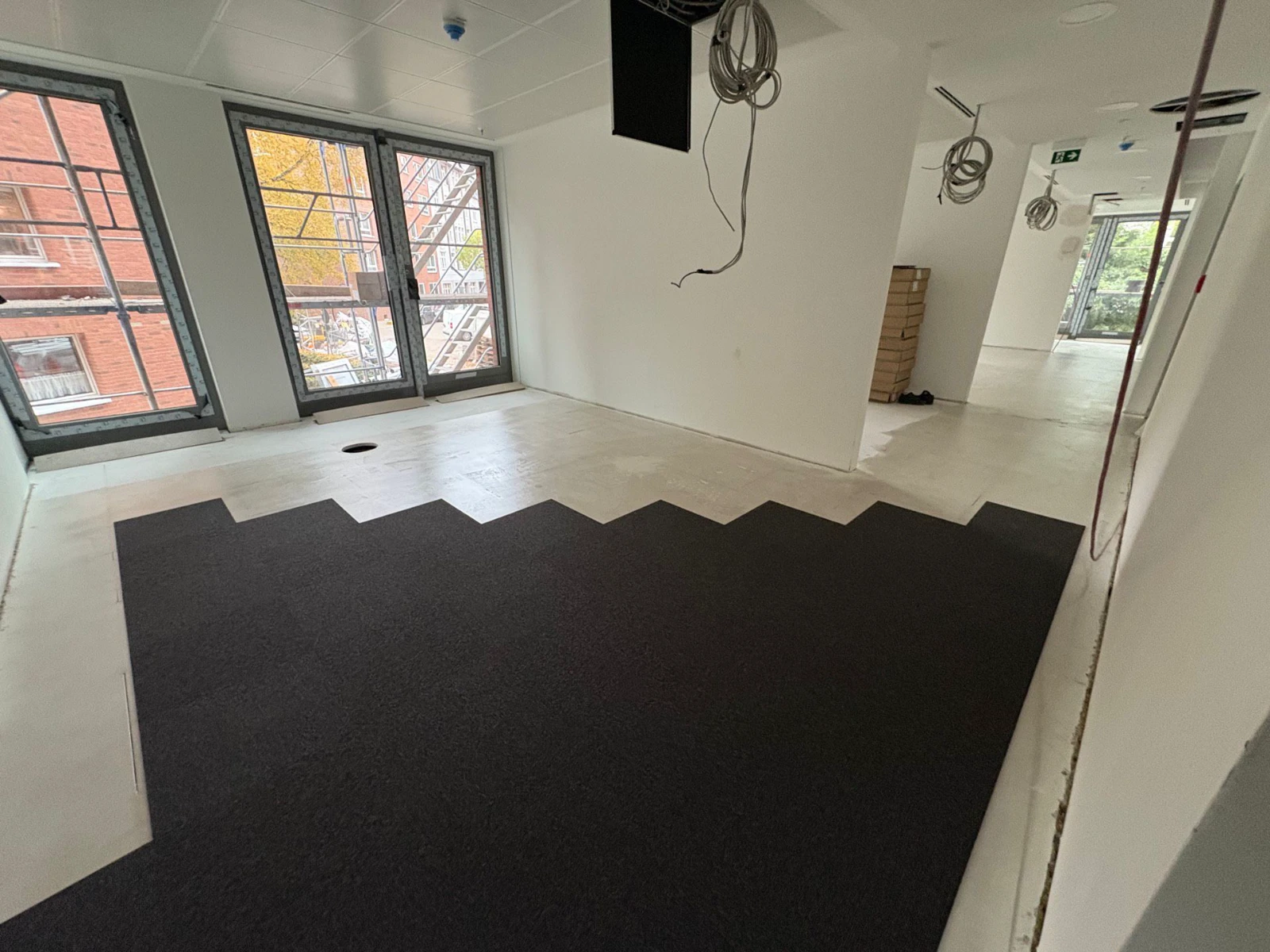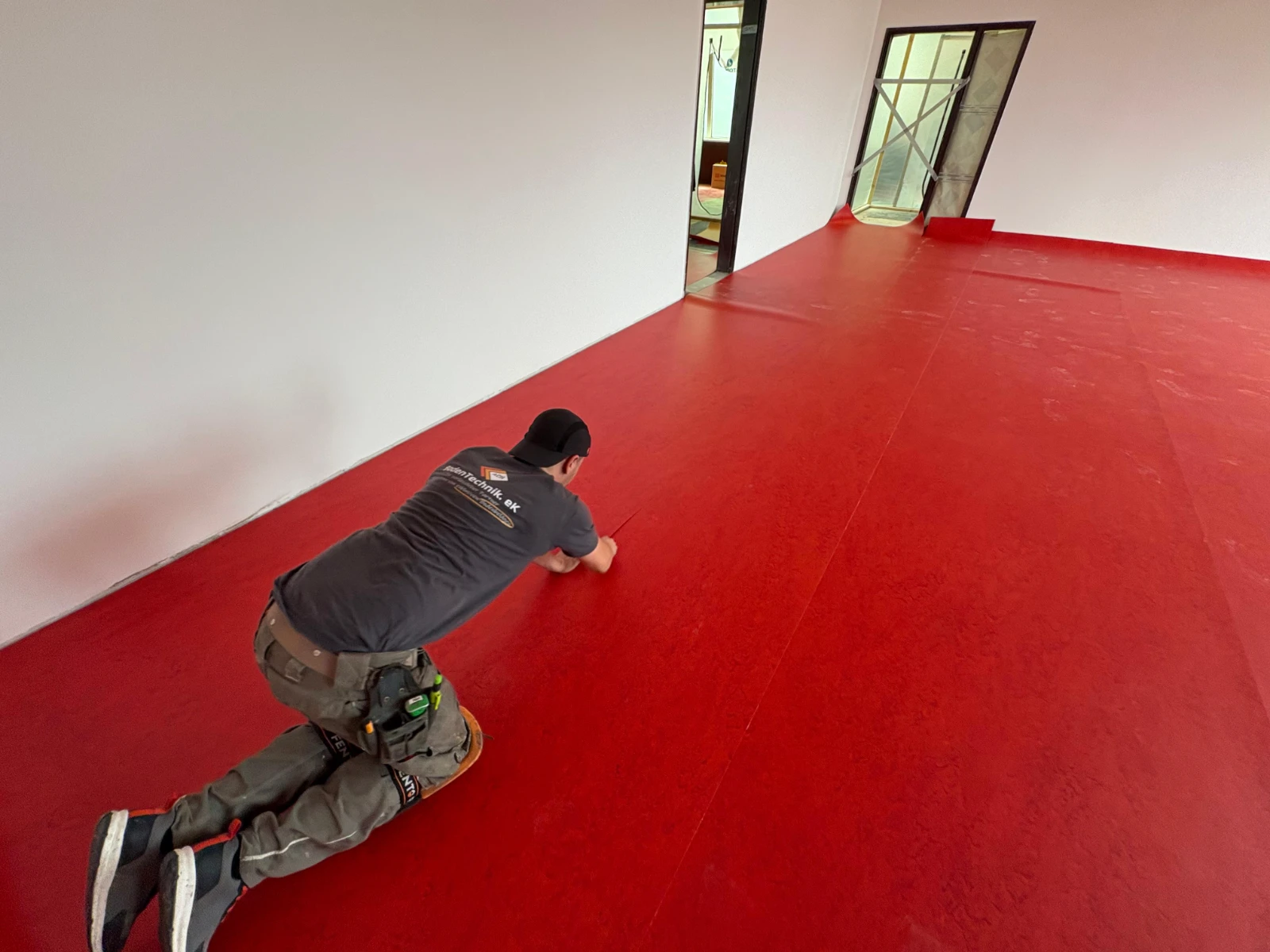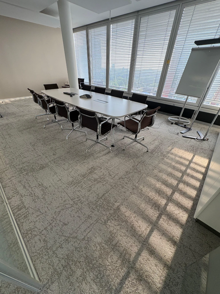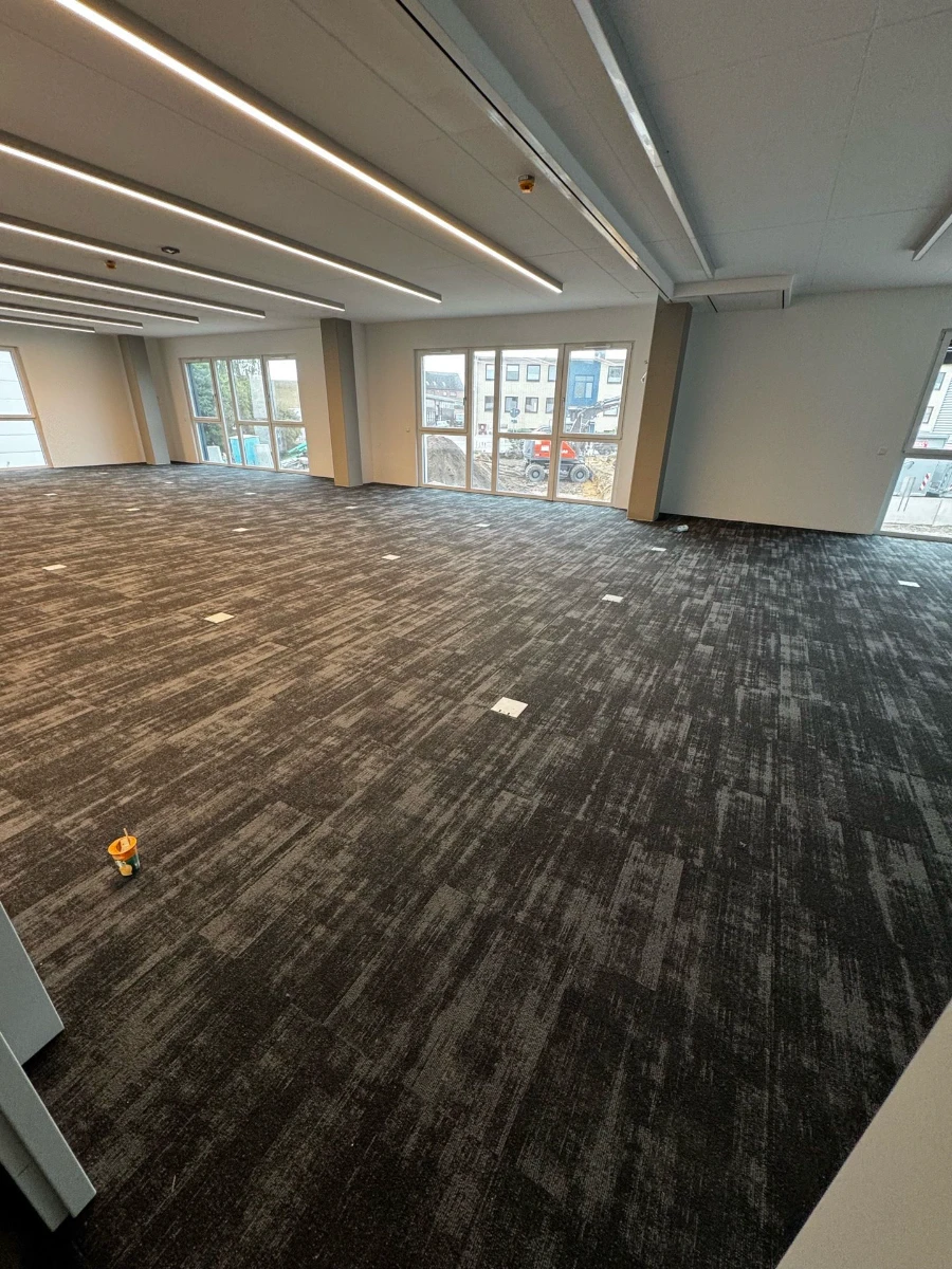 Fachgerechte Untergrundvorbereitung für die Bodenverlegung. Installation von Teppichfliesen (50×50 cm) sowie hochwertigem Vinylboden.