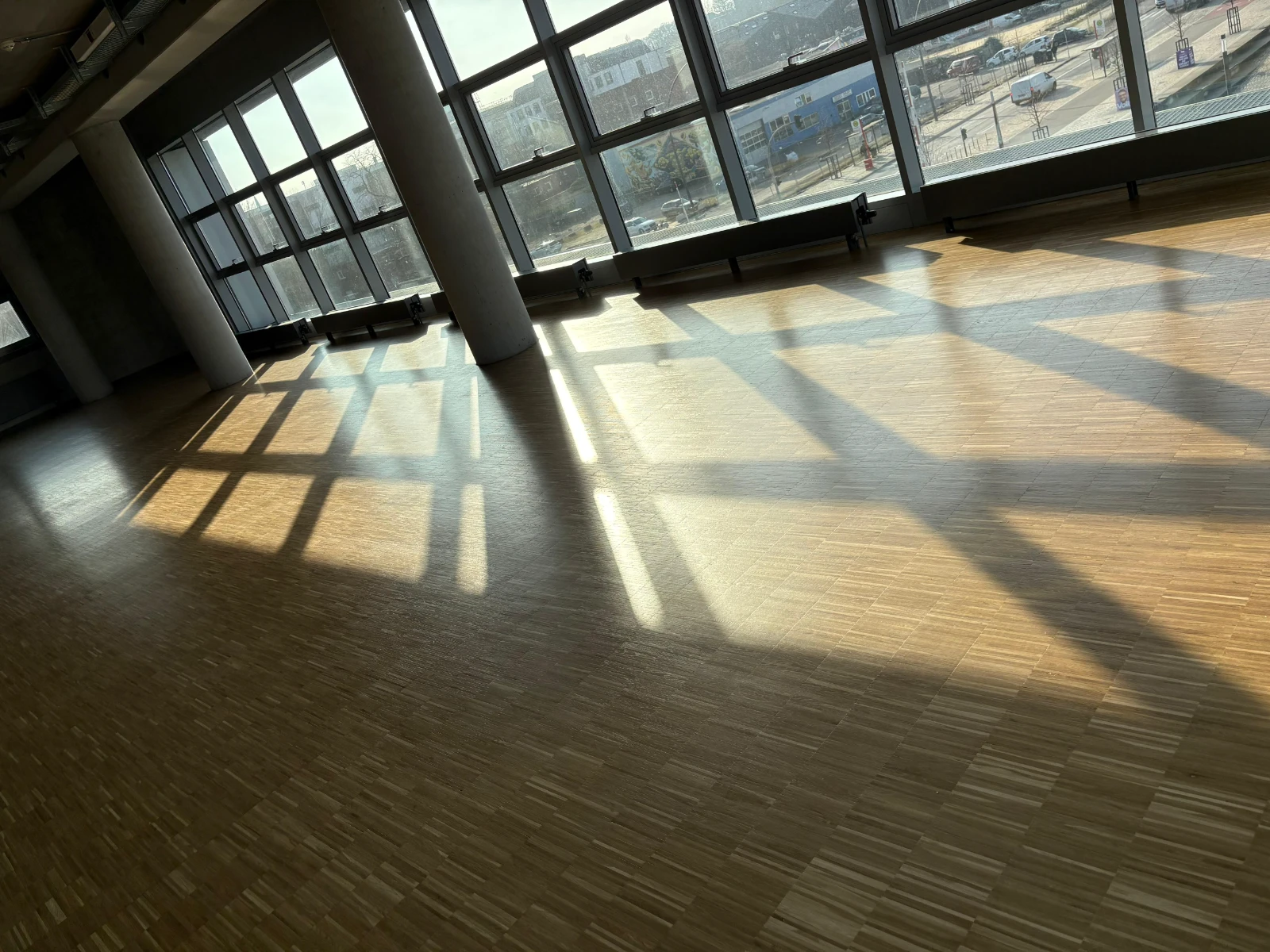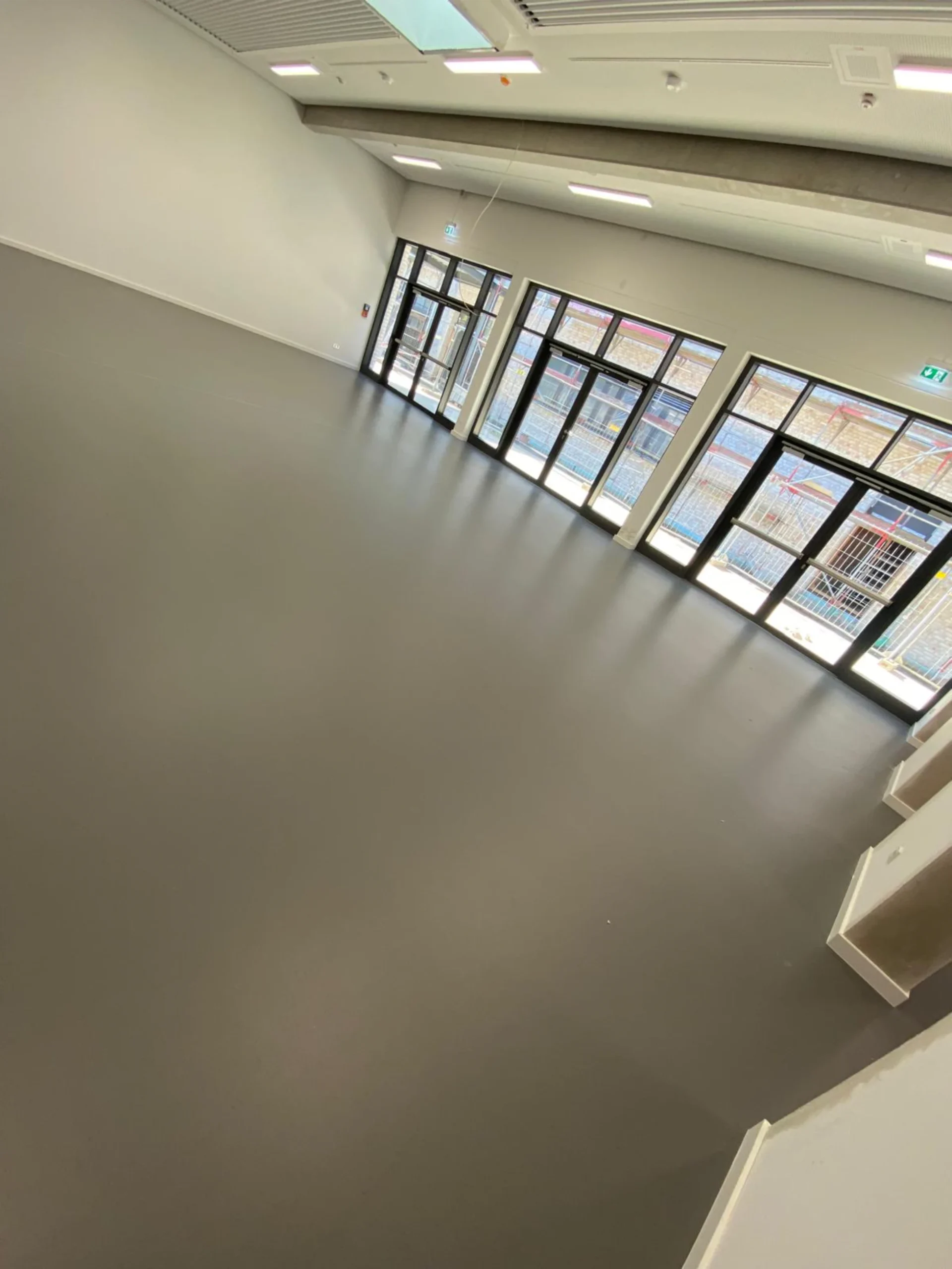 Vorbereitung des Untergrunds für die Verlegung von Kautschuk-Bahnenware in Mensa und Aula. Einbau zahlreicher Dehnungsfugenprofile aufgrund der weitläufigen, offenen Fläche.