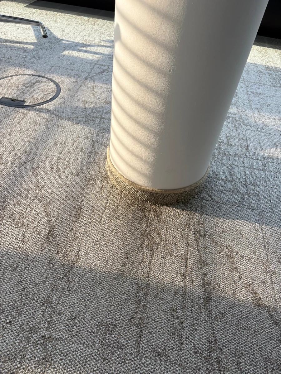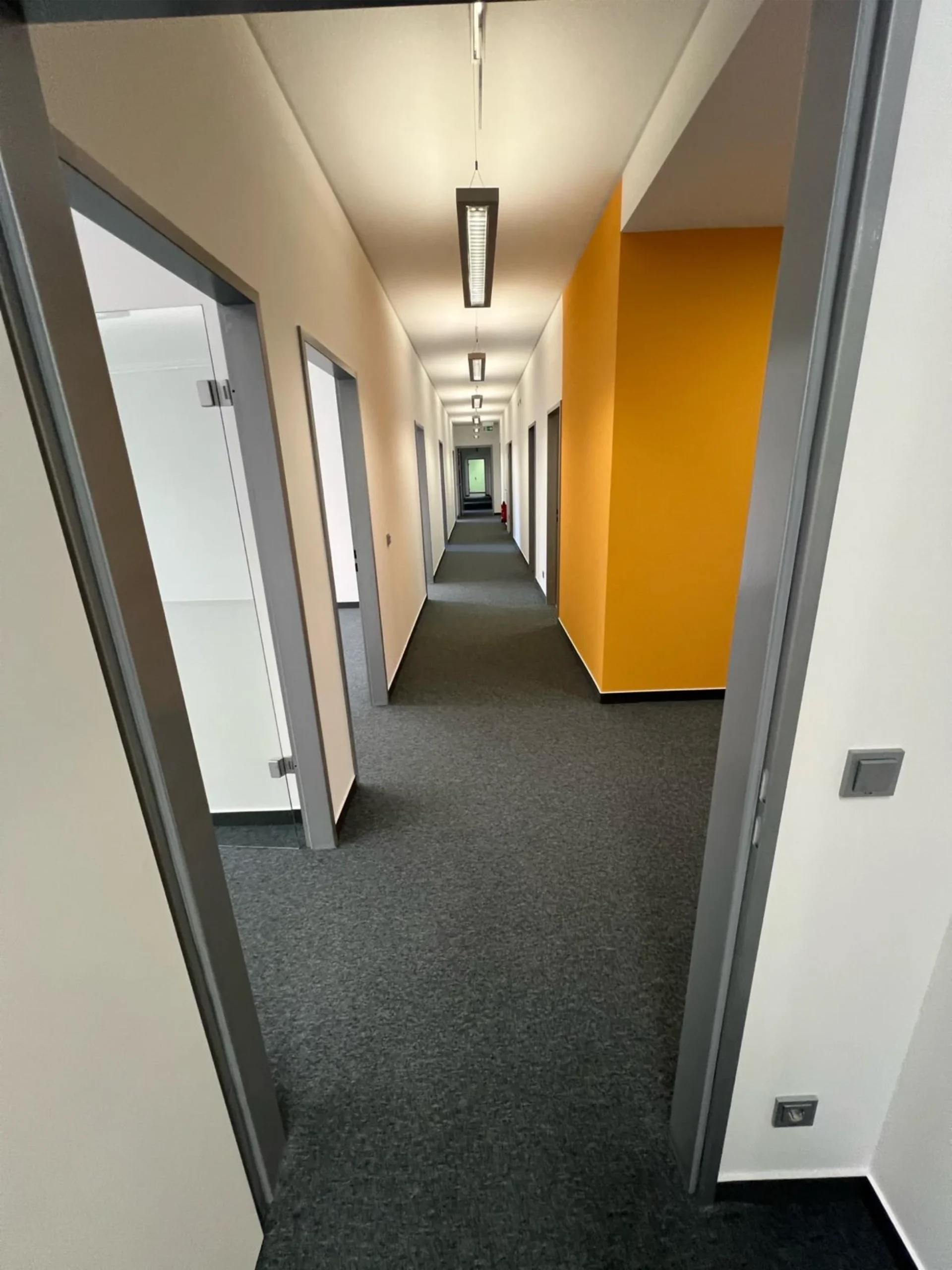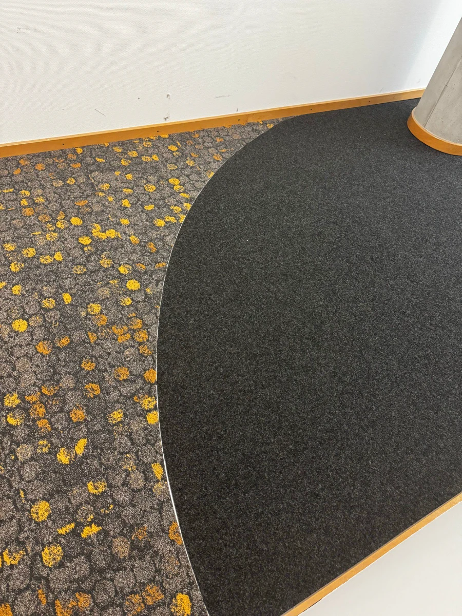 Umfassende Untergrundvorbereitung und maschinelles Einbringen von Zementestrich mittels Pumpe. Fachmännische Verlegung von Teppichfliesen (50×50 cm).