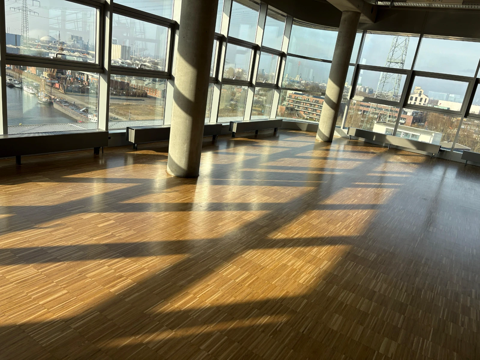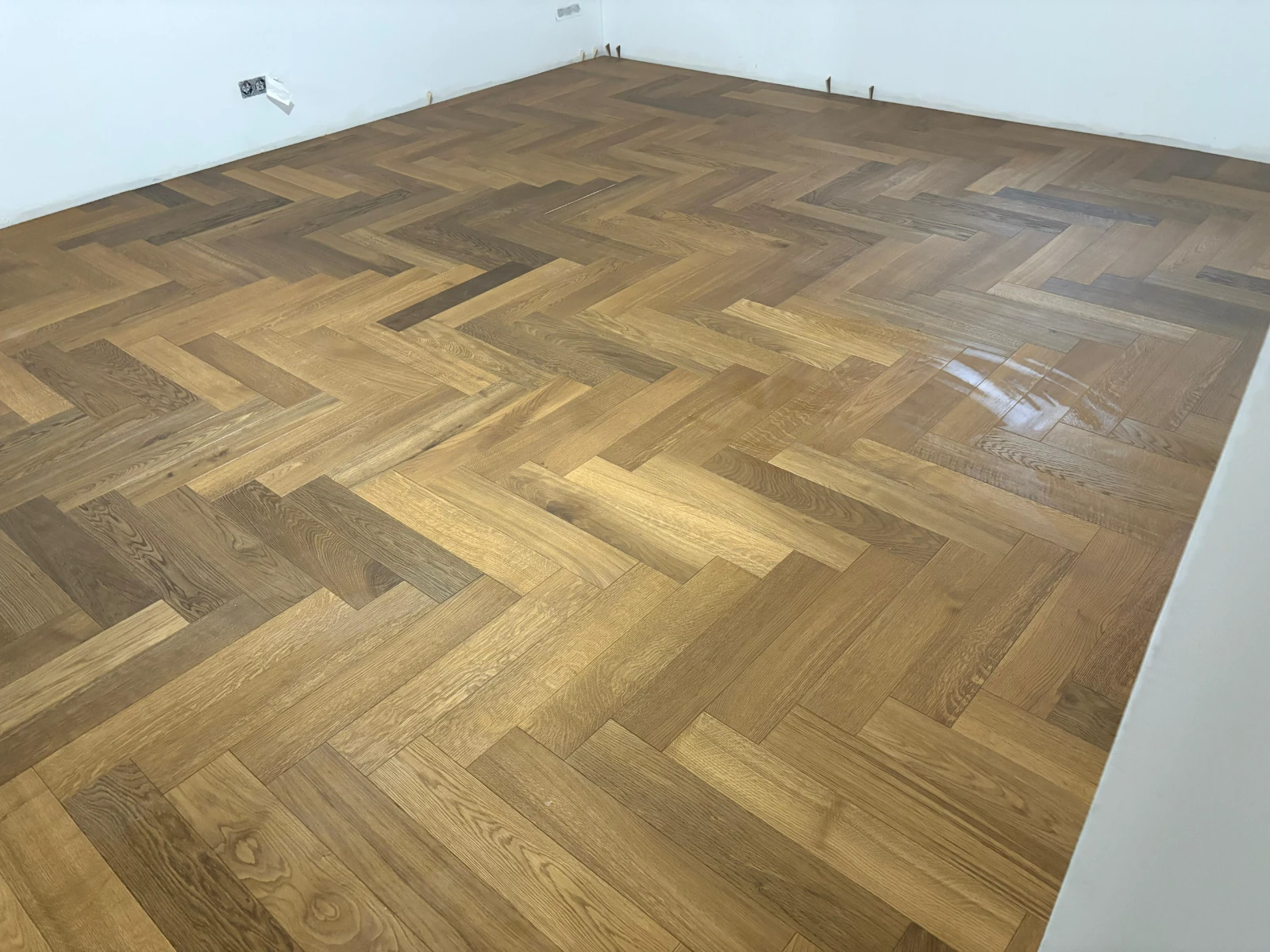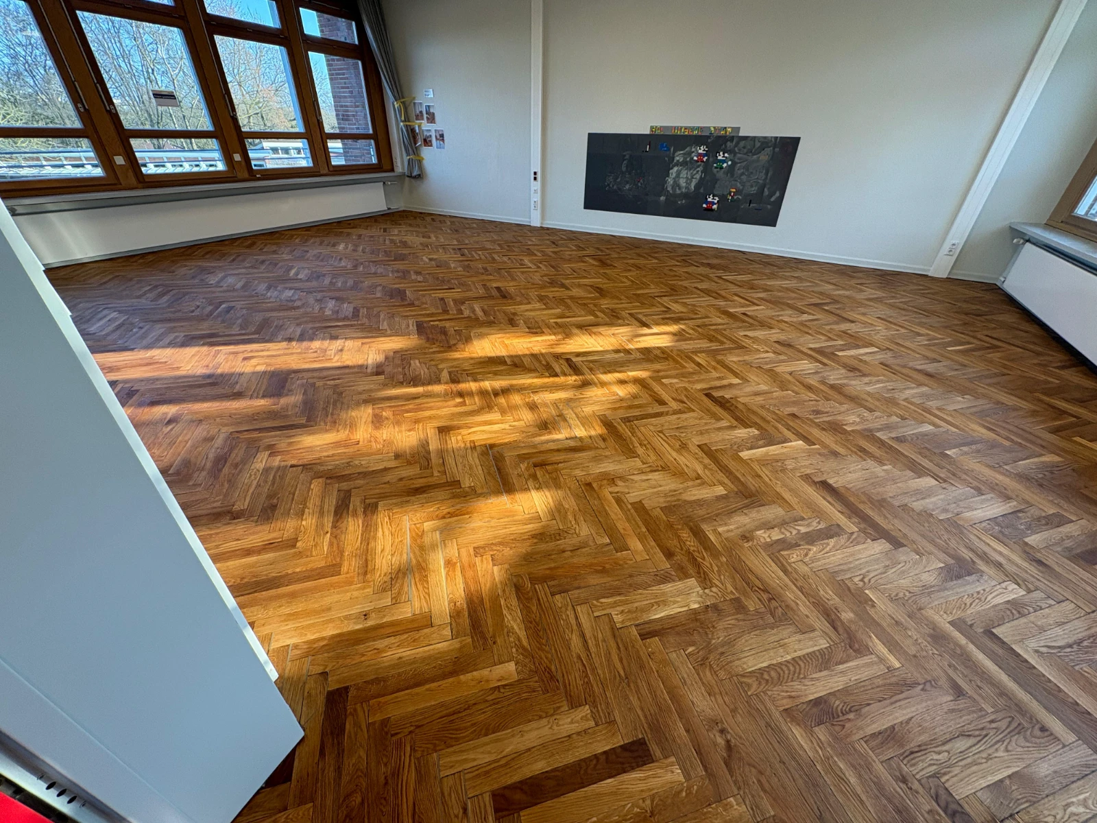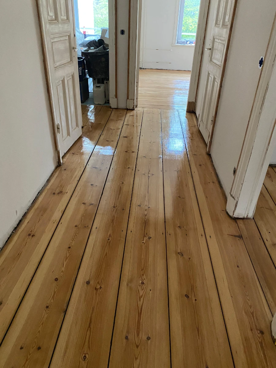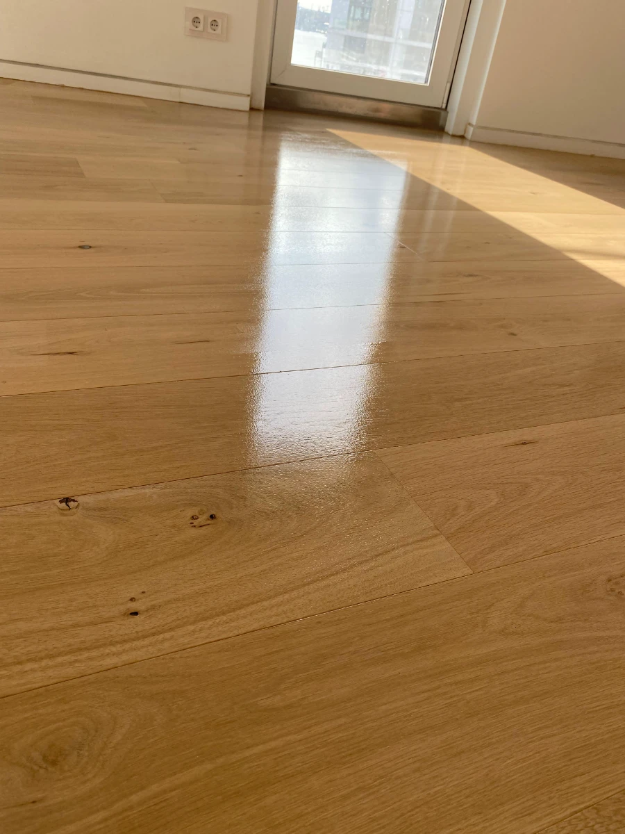 Parkettsanierung über 9 Stockwerke. Schleifen, Reparatur und Ergänzung beschädigter Stellen sowie abschließende Grundierung i Versiegelung (Lackierung).