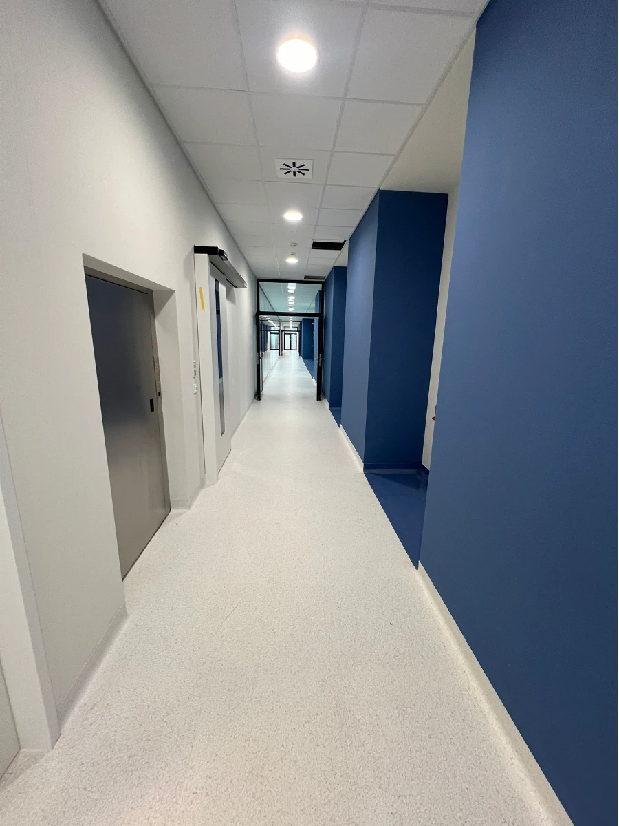 Abfräsen der alten Epoxidharzbeschichtung und Bodensanierung. Neuauftrag von Epoxidharz im Logistikzentrum sowie in den Transpottunneln für Krankenhausroboter.
